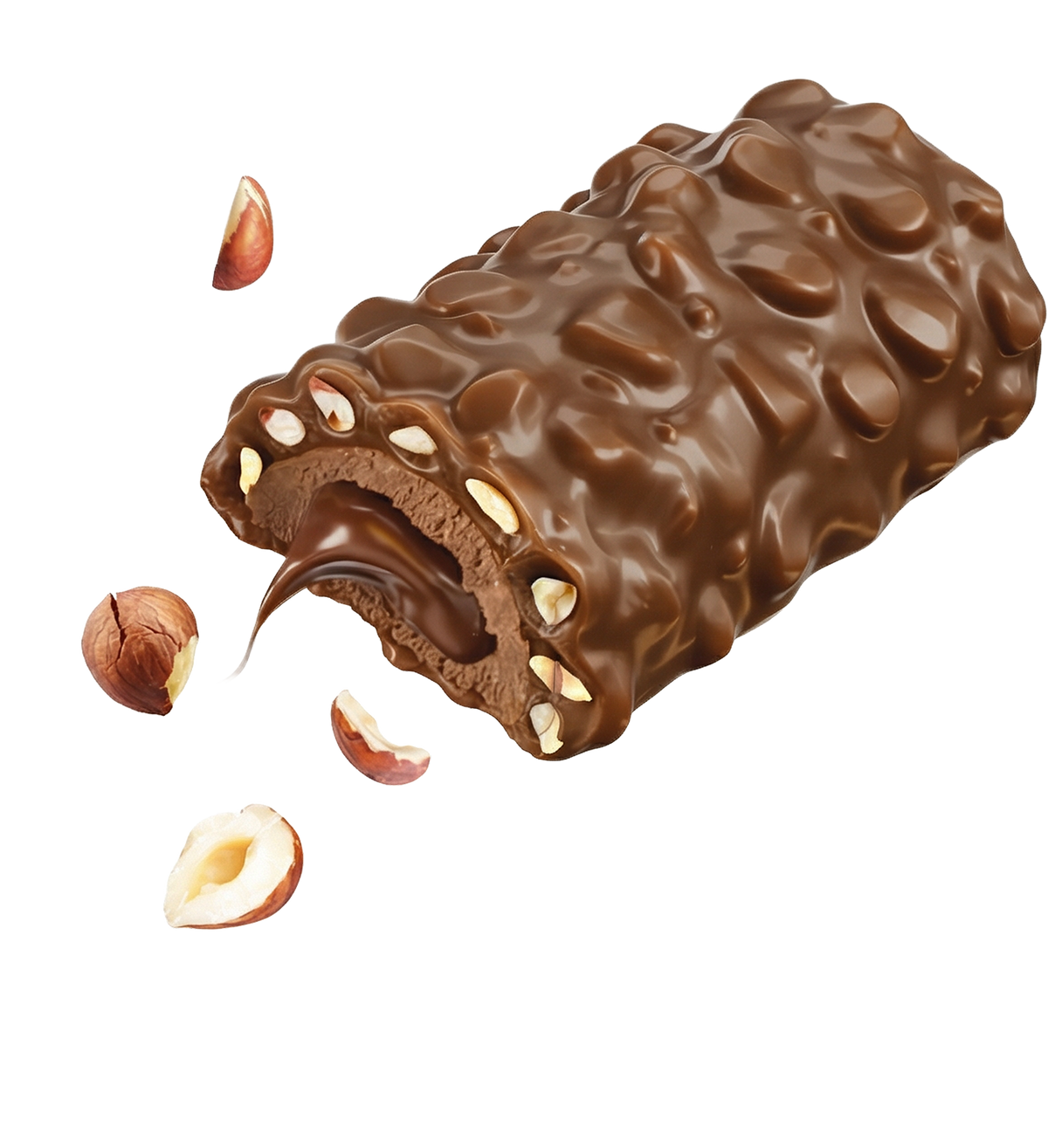 Zartschmelzende Nougat-Creme unter seidiger Milchschokolade mit gerösteten Haselnuss-Stückchen, die für den perfekten Crunch sorgen: Dieser Riegel ist eine Praline in Riegel-Form – aber mit besseren Nährwerten!
