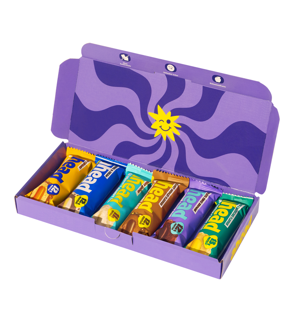 Die Schnupper-Runde: Sechs Riegel, sechs Geschmäcker. Für alle, die erstmal testen wollen. Unter 1,8 g Zucker und mit max. 187 Kalorien pro Riegel. Durchkosten, Favoriten finden und glücklich sein!