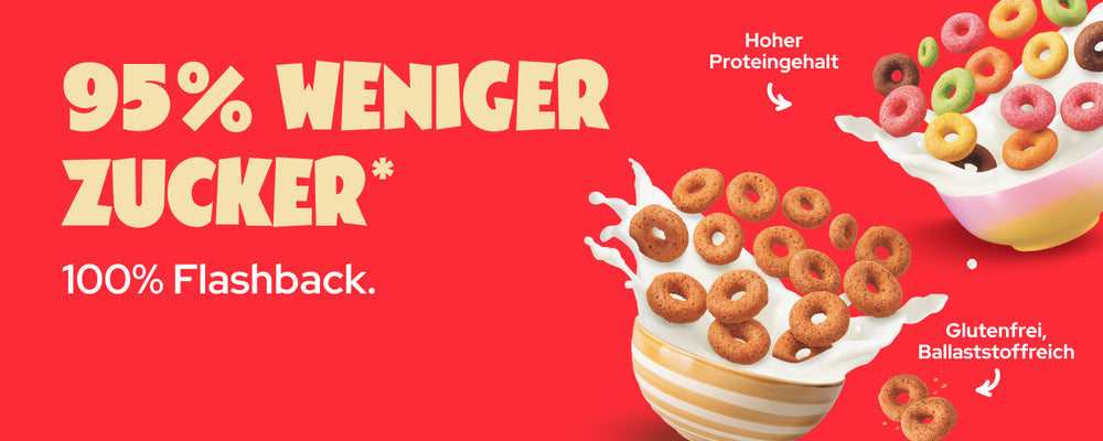 Konfetti in der Schüssel, süßer Fruchtgeschmack und der gleiche Crunch wie früher: Genau dieses Gefühl gibt's bei den Rainbow Rings zurück – nur dass jetzt auch 11 g Protein¹ und 95 % weniger Zucker² zum Frühstücksfest gehören!