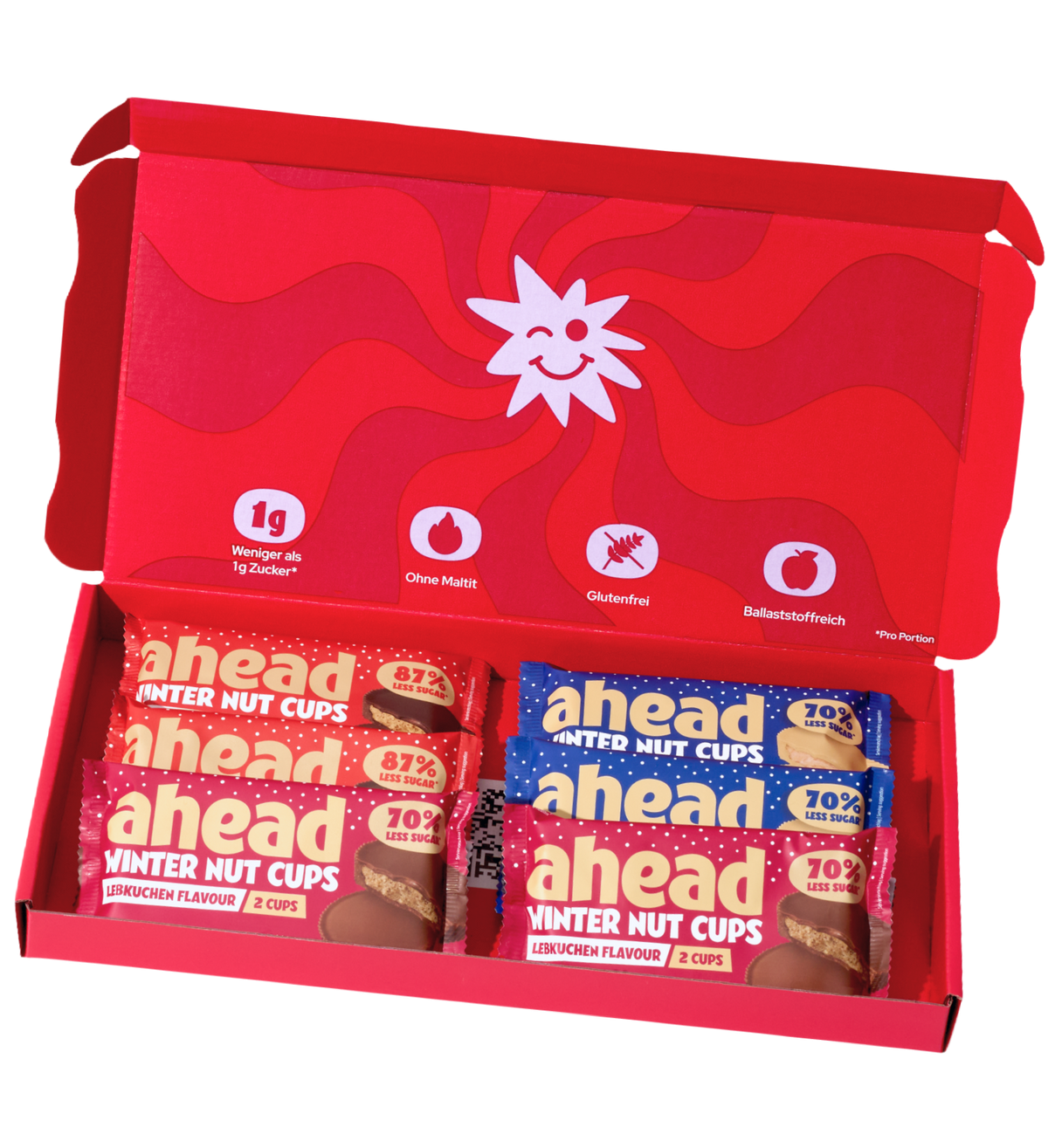Nut Butter Cups Mini-Probierpaket Winter Edition Nut Butter Cups mit bis zu 87 % weniger Zucker¹ Nut Butter Cups mit bis zu 87 % weniger Zucker¹